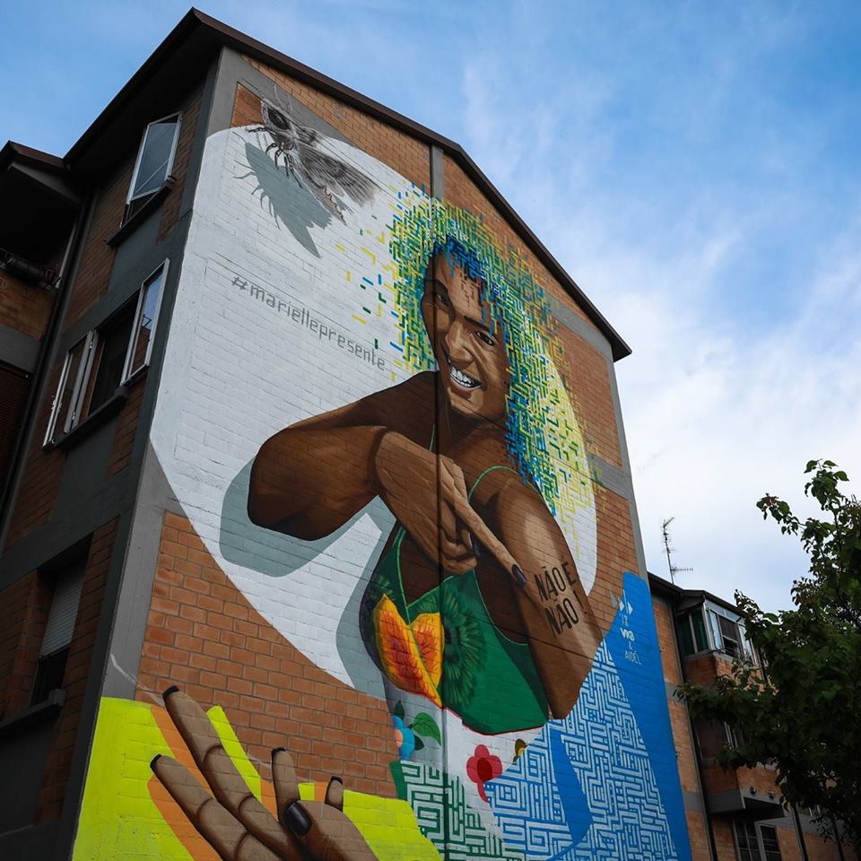“Abbiamo scelto un quartiere periferico di Ferrara, con un passato un po’ tormentato tanto da essere definito, in passato, il “Bronx” della città, riabilitato e poi di nuovo trascurato. Abbiamo trovato la parete perfetta di una casa popolare, rivolta verso ovest, verso il Brasile: così il sorriso di Marielle è esposto verso il suo Paese.
