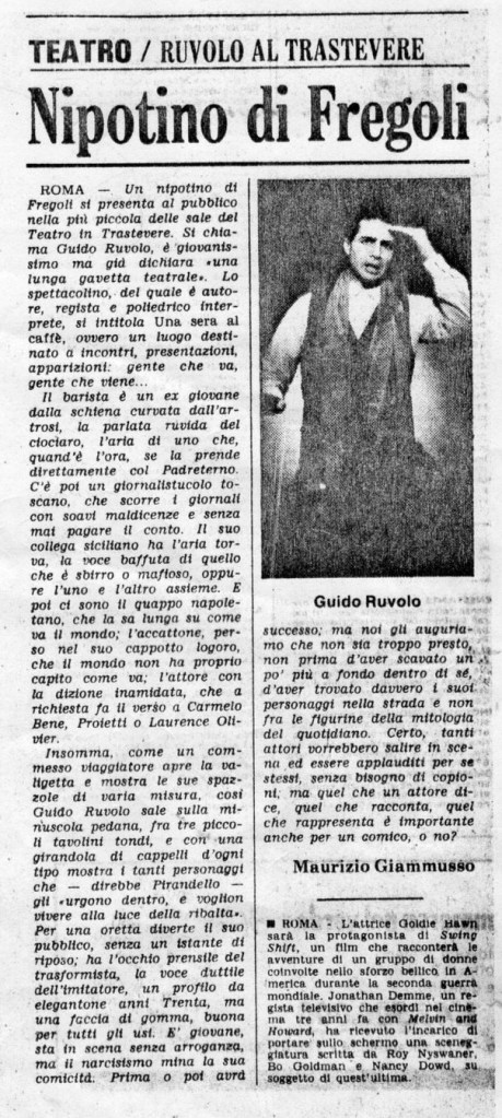 “Questo lo ha reso il mio eroe: un uomo, un attore che ce l’ha fatta da solo. Il teatro per lui era vita. Il personaggio Guido e la persona Guido erano un tutt’uno. Ogni esperienza che gli capitava, diventava un atto da portare in scena, così reale da crederci. Penso ai suoi racconti giornalieri sui suoi incontri quando andava a fare la spesa al mercato. Le origini della zuccheriera acquistata ad un banco dell’antiquariato, si trasformavano in versi di un’opera da ascoltare, concentrati. La ferita che si era provocato cadendo in bicicletta, per tutti era la conseguenza del morso di uno squalo. I nostri giri in vespa per Roma rimangono pagine di romanzo tratte da vicoli, monumenti, insegne di negozio. Nell’ultimo periodo che ha dovuto vivere senza stare tra la gente per il virus, gli mancava tanto non prendere autobus e metropolitana: erano fonti continue di ispirazione.